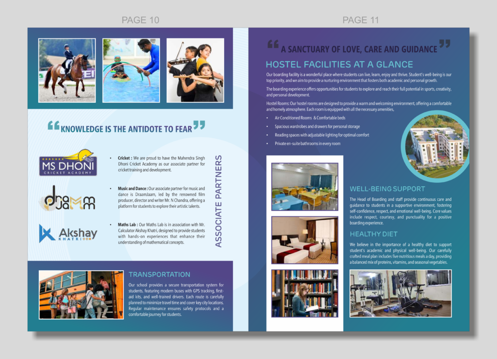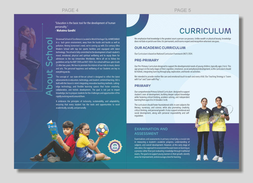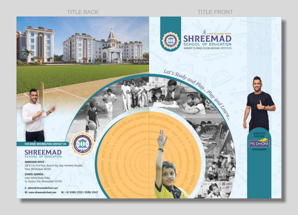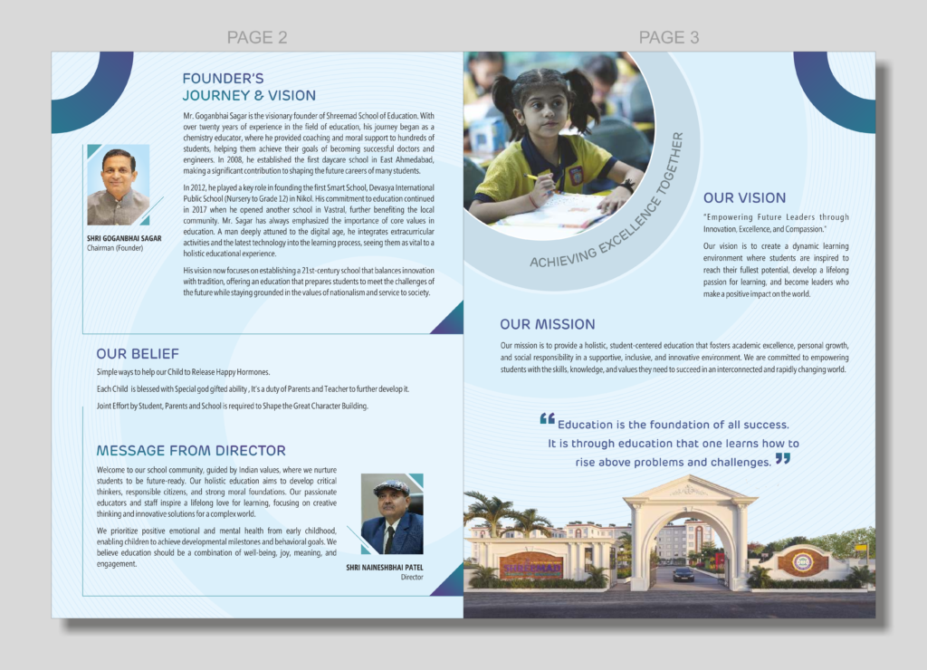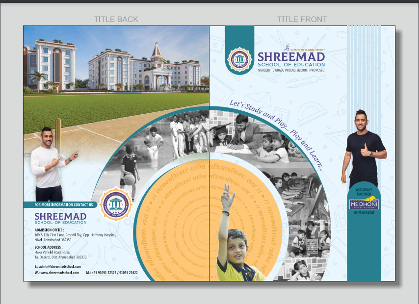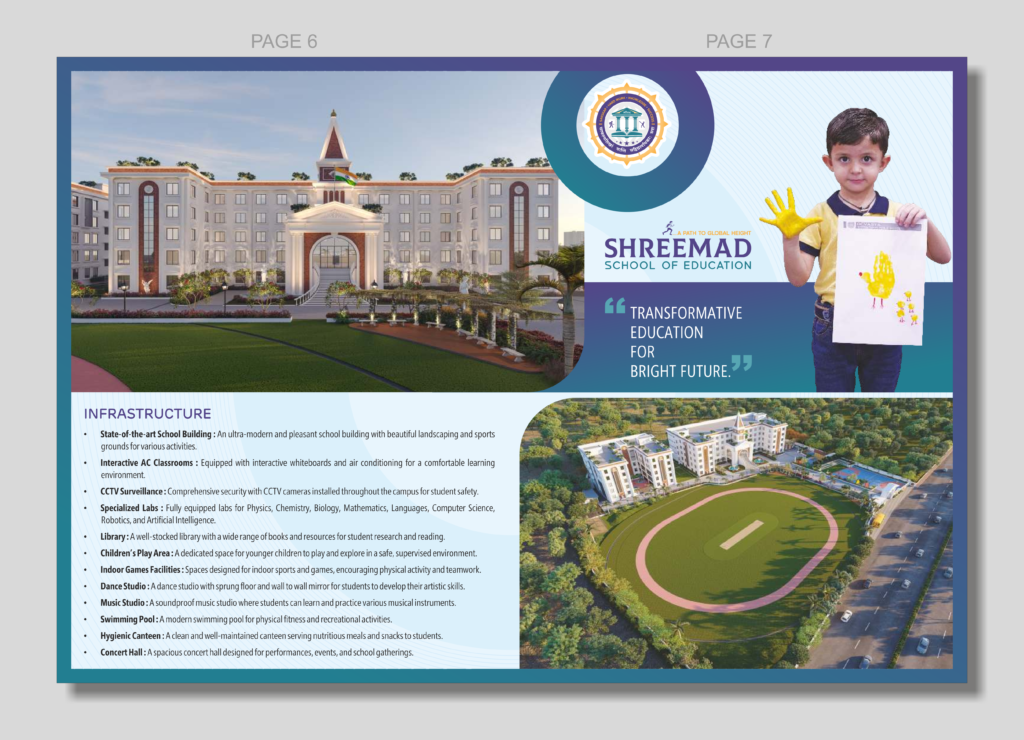 Here’s a suggested content structure for the brochure of “Shreemad School”. The brochure could be designed to highlight the school’s values, facilities, academic programs, extracurricular activities, and more, to attract prospective students and parents.